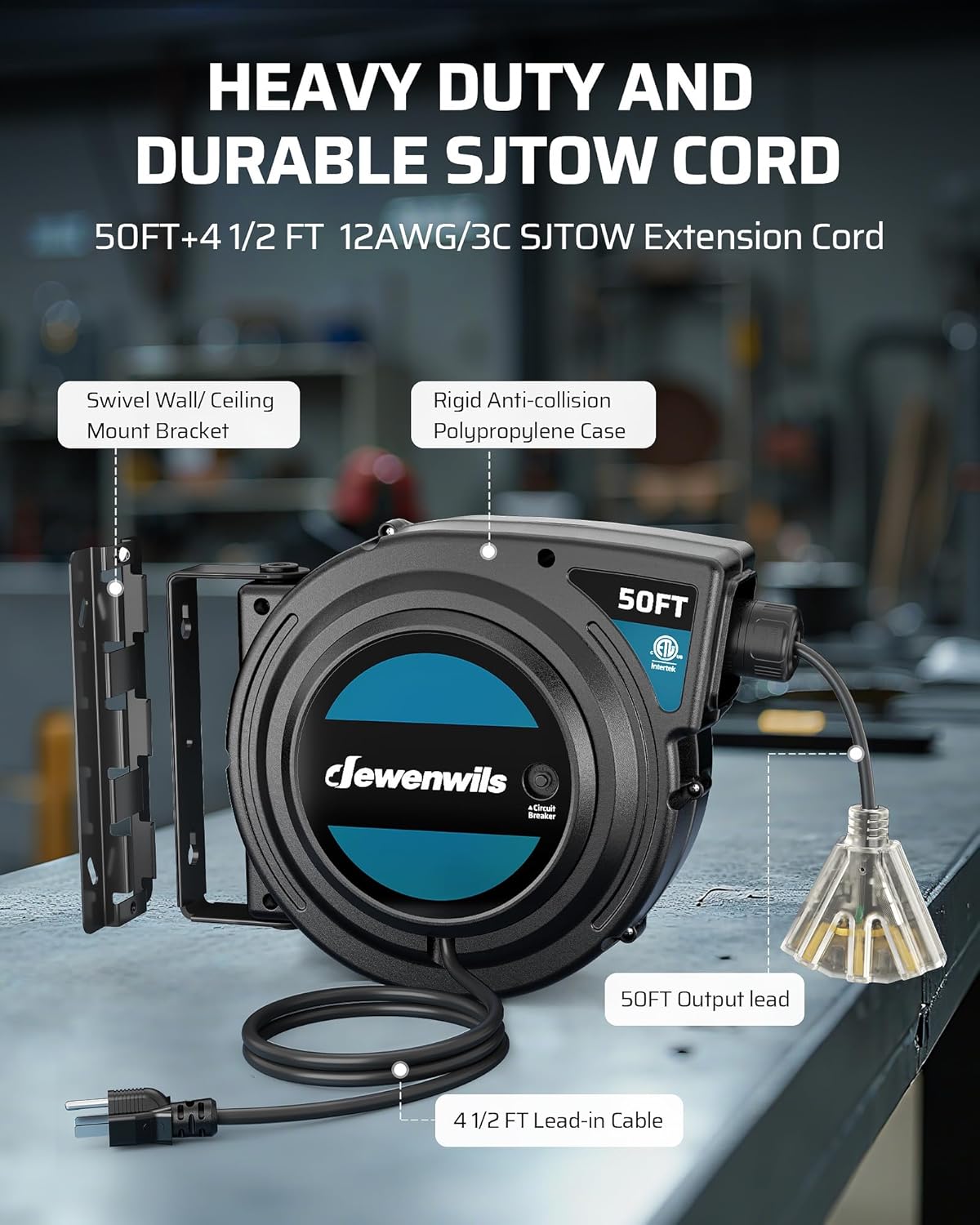 - 50ft auto-retractable cord reel extends reach while keeping your garage or shop clutter-free.