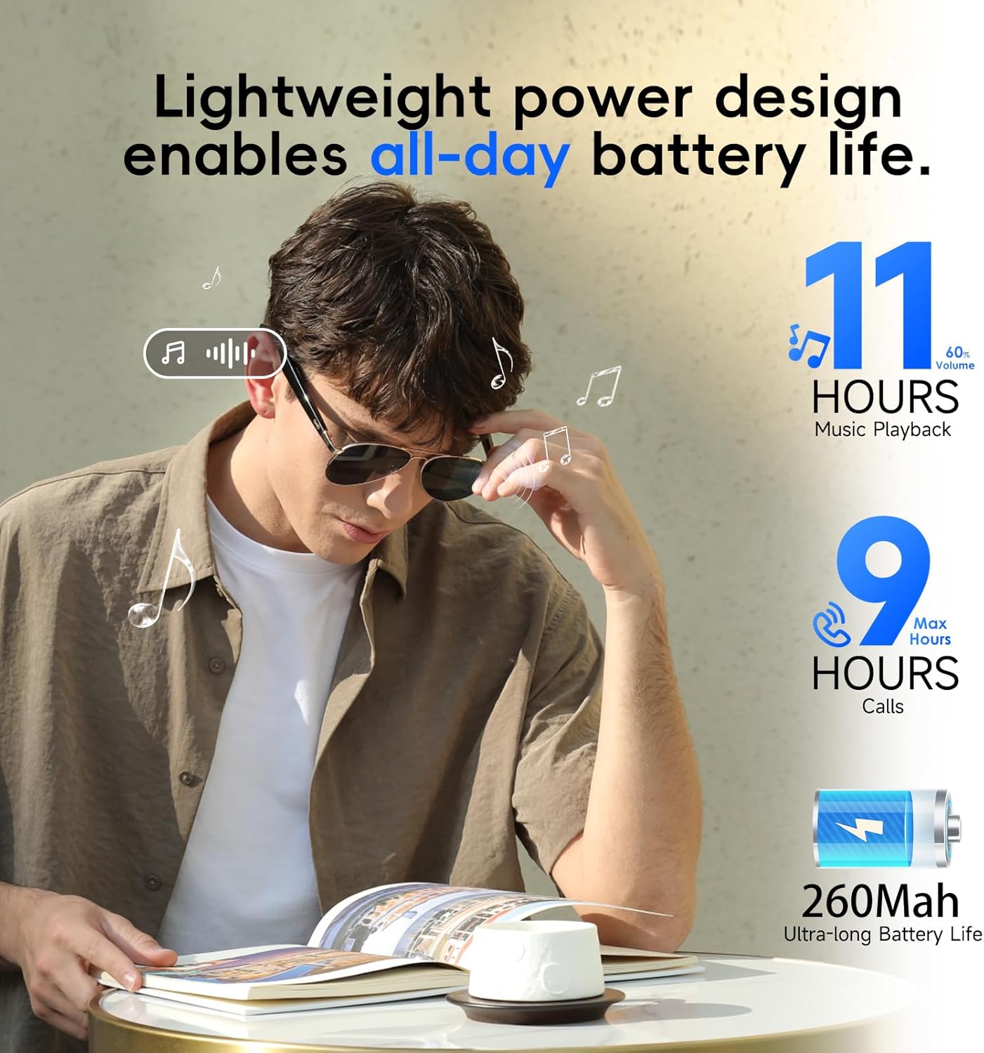 • Round aviator-style frame keeps a classic look without adding bulky headphones.